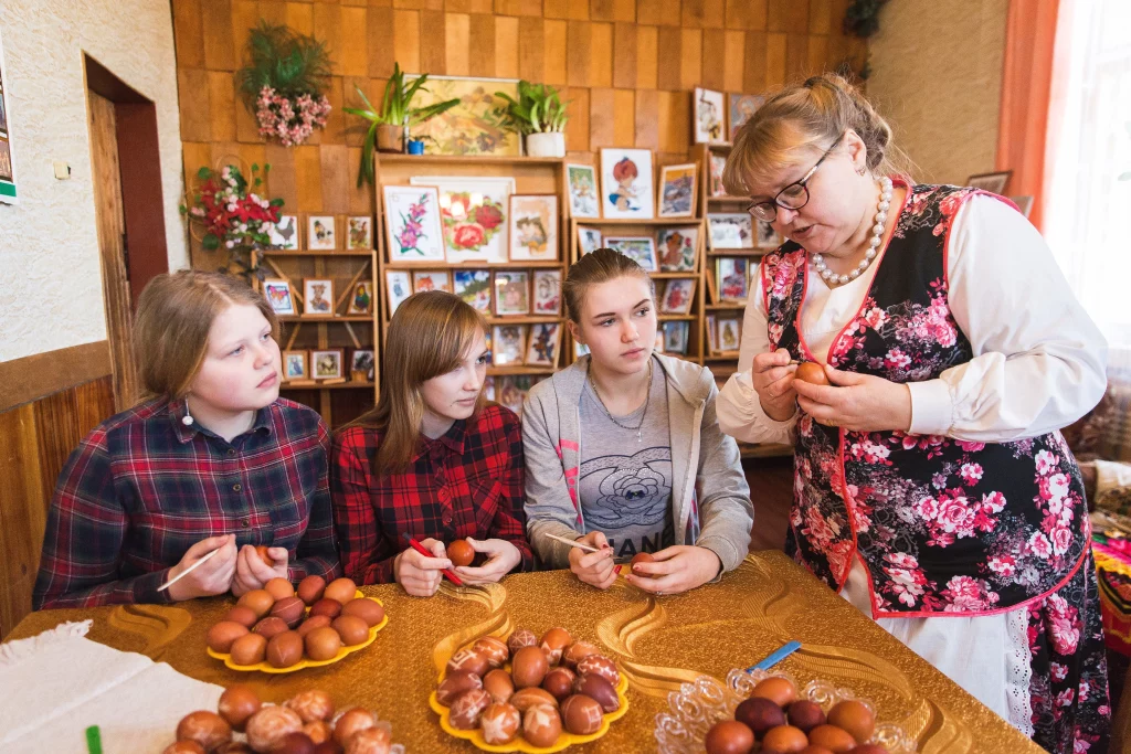 In the village of Dorosino, a unique technique for decorating Easter eggs – “shkrabank” has been preserved. Marina Vakulchik, the director of the local House of Culture, owns an unusual technique. The folk master decorates Easter eggs exclusively with ancient sacred symbols. Each ornament: a line, a ribbon, a square on a red egg has its own meaning. Marina Vakulchik willingly shares her skills with children and adults.